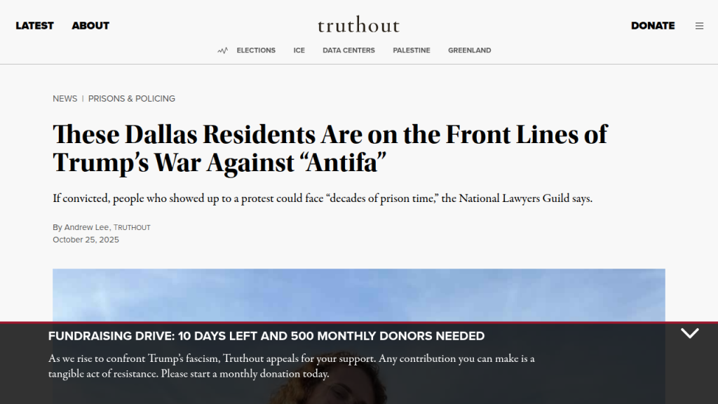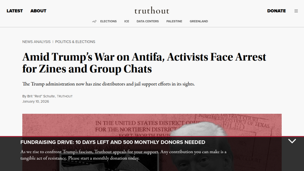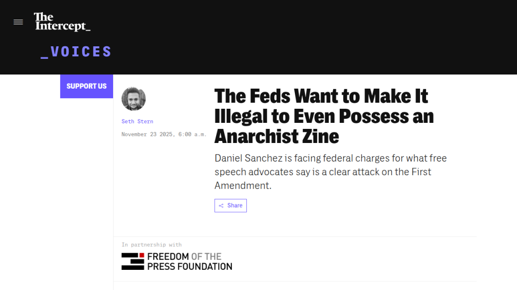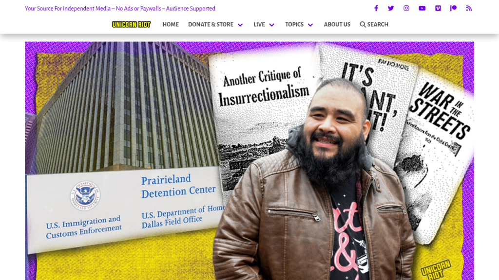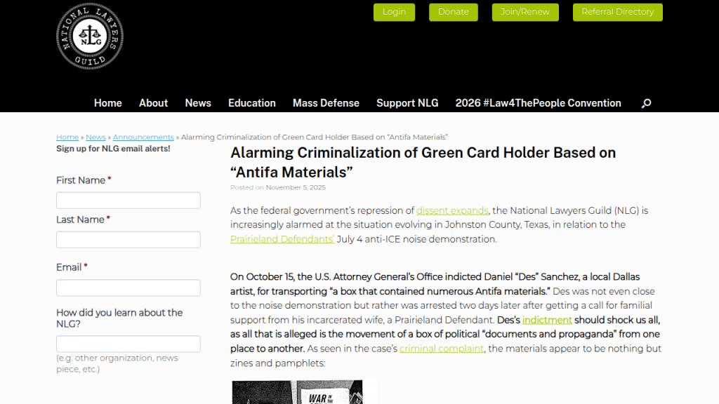 February 17, 2026 – 9 people charged in the Prairieland ICE shooting go on trial this week. Here’s what’s at stakeFebruary 16, 2026 – Prison-Style Free Speech Censorship Is Coming for the Rest of UsFebruary 13, 2026 – The Road to Prairieland: The Crackdown on Anti-ICE Activists in Texas Reflects a Pattern of Intensifying RepressionJanuary 30, 2026 – The arrest of Don Lemon is blatant censorship. And he is not the only oneJanuary 23, 2026 – Immigration Protester Faces Terrorism Charges, Deportation as Trial ApproachesJanuary 10, 2026 – Amid Trump’s War on Antifa, Activists Face Arrest for Zines and Group ChatsDecember 4, 2025 – “I’m Not Fleeing” — Alleged Antifa Cell Member Says He Was Accidentally Released From JailNovember 23, 2025 – The Feds Want to Make It Illegal to Even Possess an Anarchist ZineNovember 5, 2025 – Alarming Criminalization of Green Card Holder Based on “Antifa Materials”October 25, 2025 – These Dallas Residents Are on the Front Lines of Trump’s War Against “Antifa”
